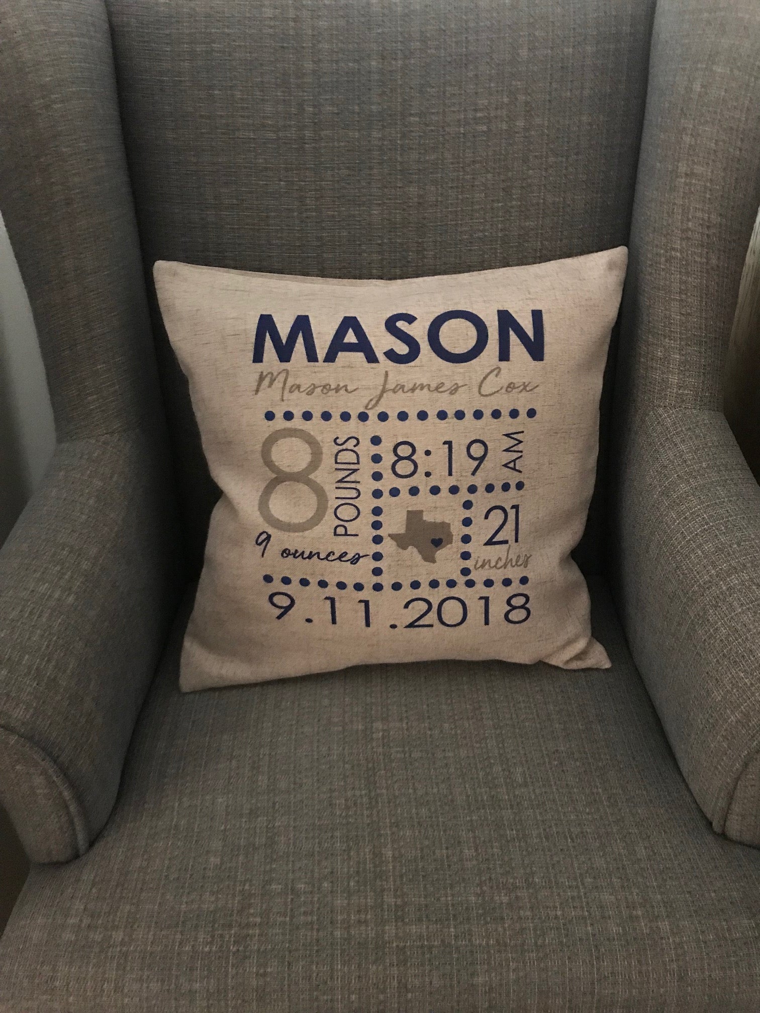 This beautiful, high quality throw pillow is a perfect addition to the baby's nursery. Announce baby's name and stats with this soft, faux burlap pillow.