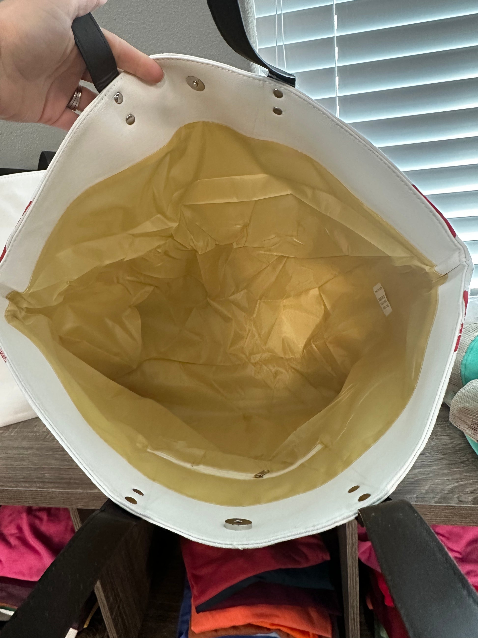 16.5” tall x 21.5” wide x 6.5” deep Fully lined with a magnetic snap closure, a zippered pocket inside and handles that are long enough to go over the shoulder. Squared bottom 6.5” wide for maximum packing!