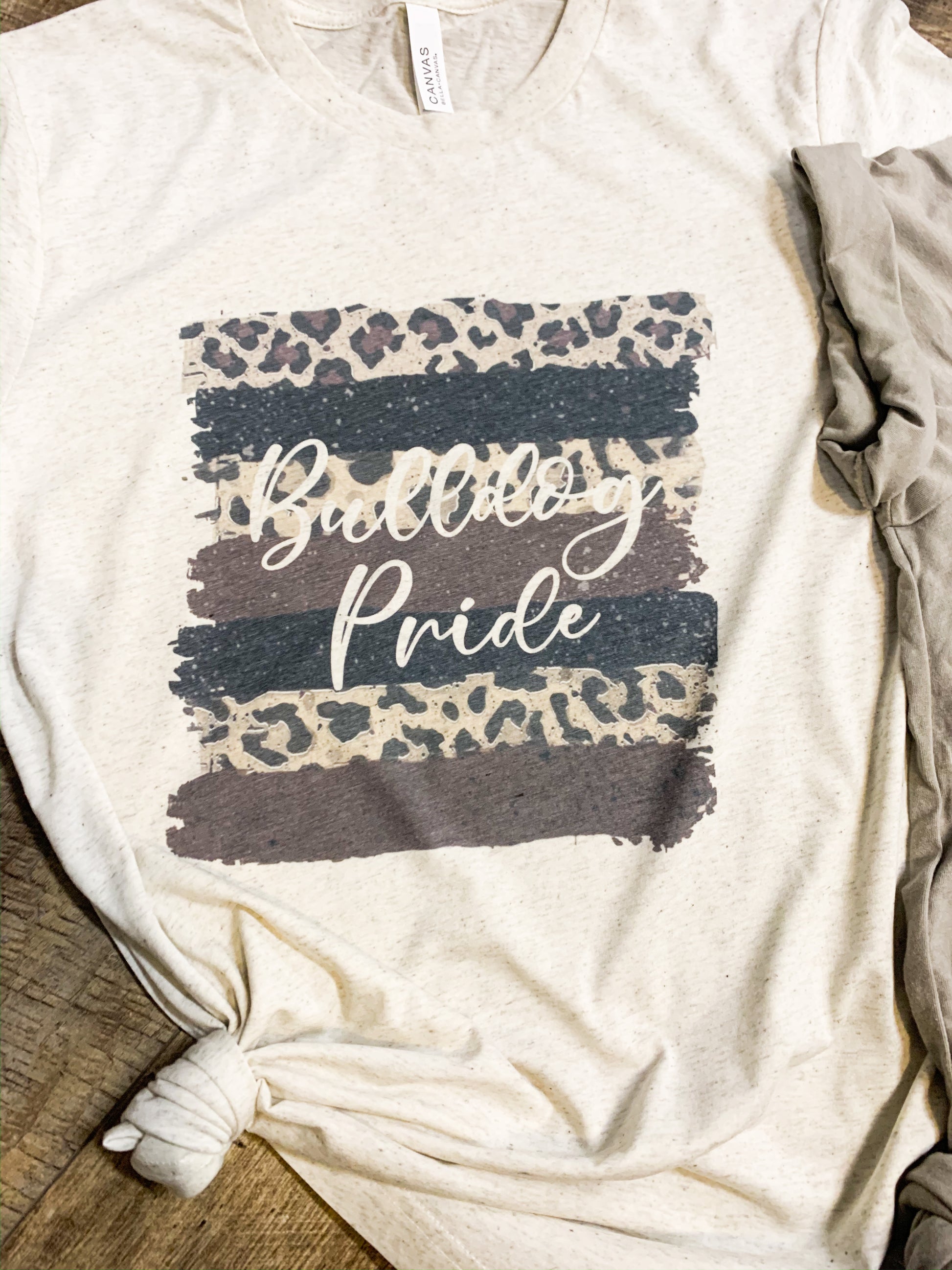 Show your Bulldog Pride! This design is permanently printed on your choice of an oatmeal (left side) or stone (right) super soft shirt. It will last through lots of wears and washes!
