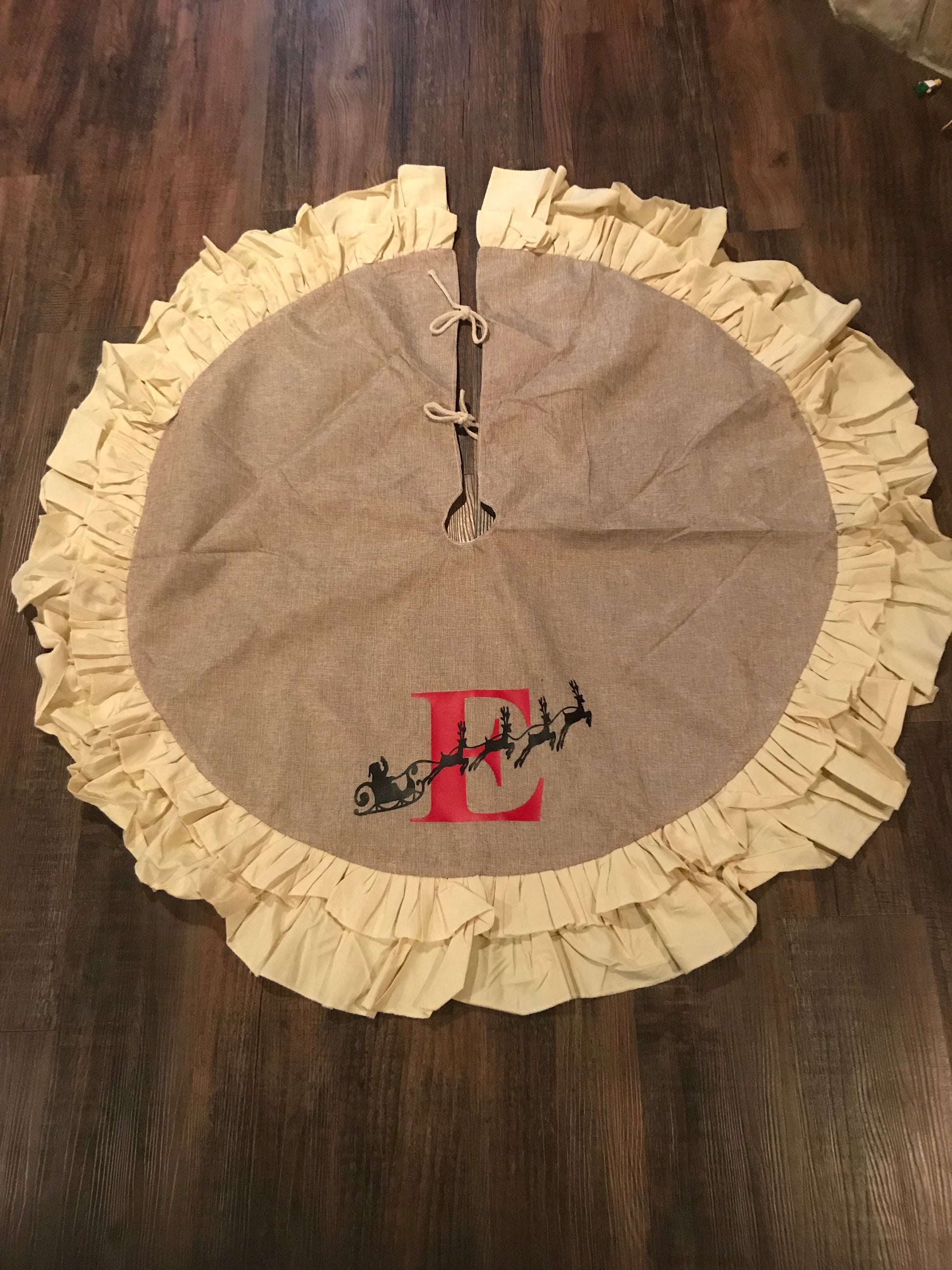 This faux burlap Christmas tree skirt brings the vintage farmhouse style to your Christmas decor! Complete with cream or red ruffles, this skirt can be customized with your family monogram, name or other design.