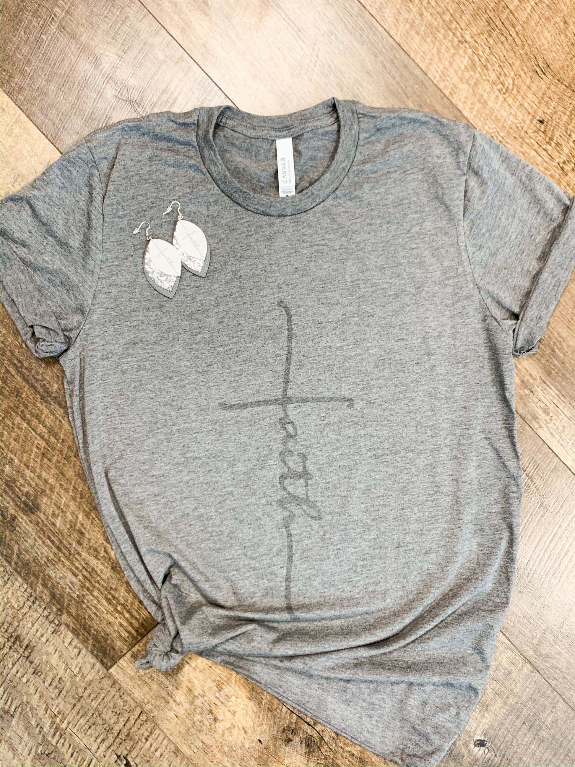 "Faith" is a permanent sublimation print, so it’s more of a worn vintage look. Printed on a grey triblend shirt, this soft and comfy tee will wash and wear over and over!