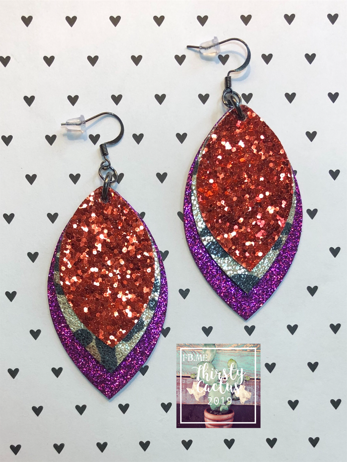 UPDATE: NOW AVAILABLE IN A BUNDLE! Add a set of these adorable earrings to complete the LOVE NEVER FAILS outfit! Triple drop earrings are nickel free and feature chunky red glitter, a layer of leopard and chunky purple glitter. $40 bundle INCLUDES SHIPPING. Use code BUNDLE when you place your order for both the earrings and t-shirt.