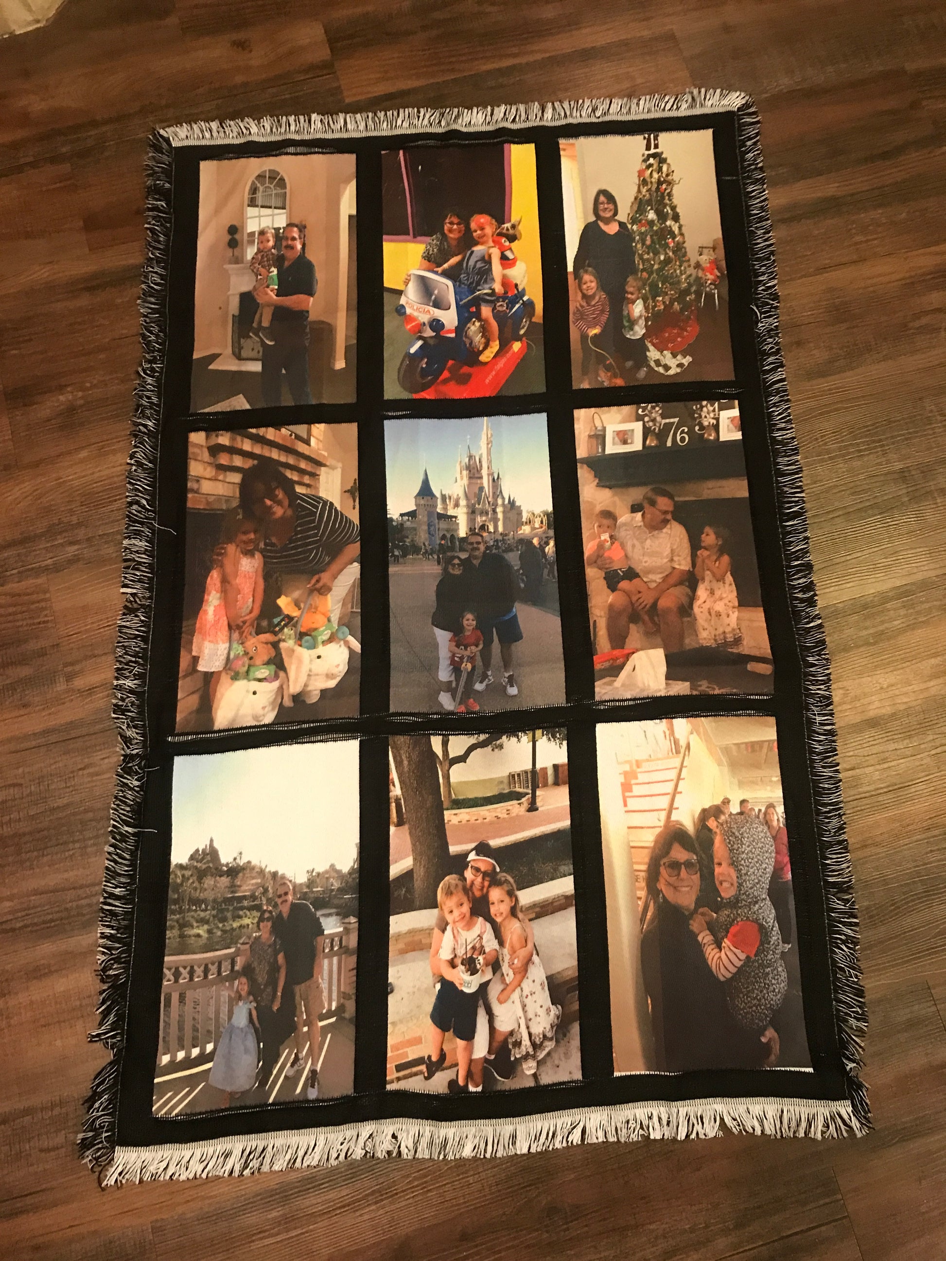 This blanket makes a great throw for your couch or bed, a gift for parents or grandparents, or even for a college kid with pictures and college logos.