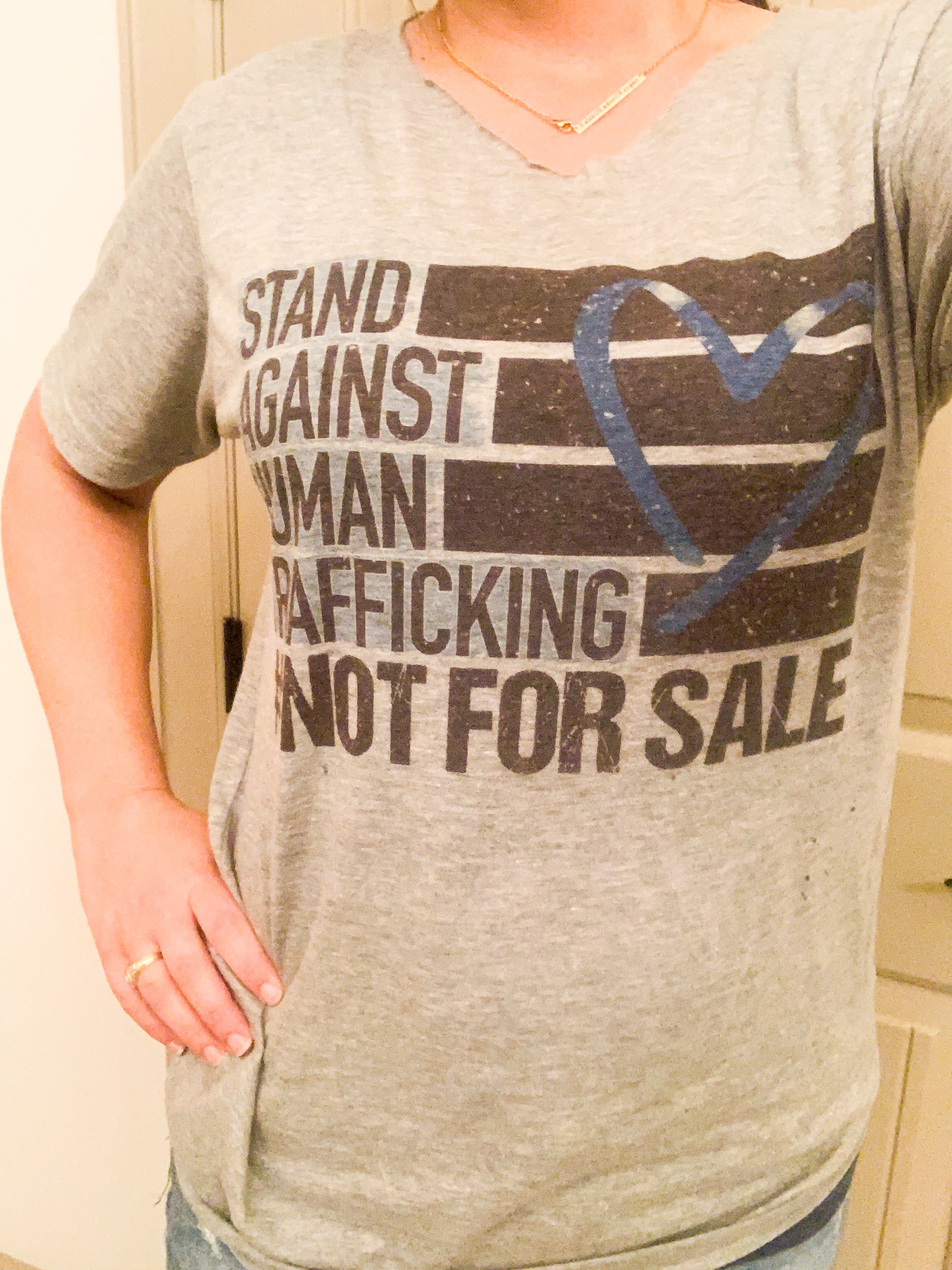 Stand Against Human Trafficking is a permanent print design on a super soft heather grey shirt. Wash and wear over and over without fading or peeling like vinyl.