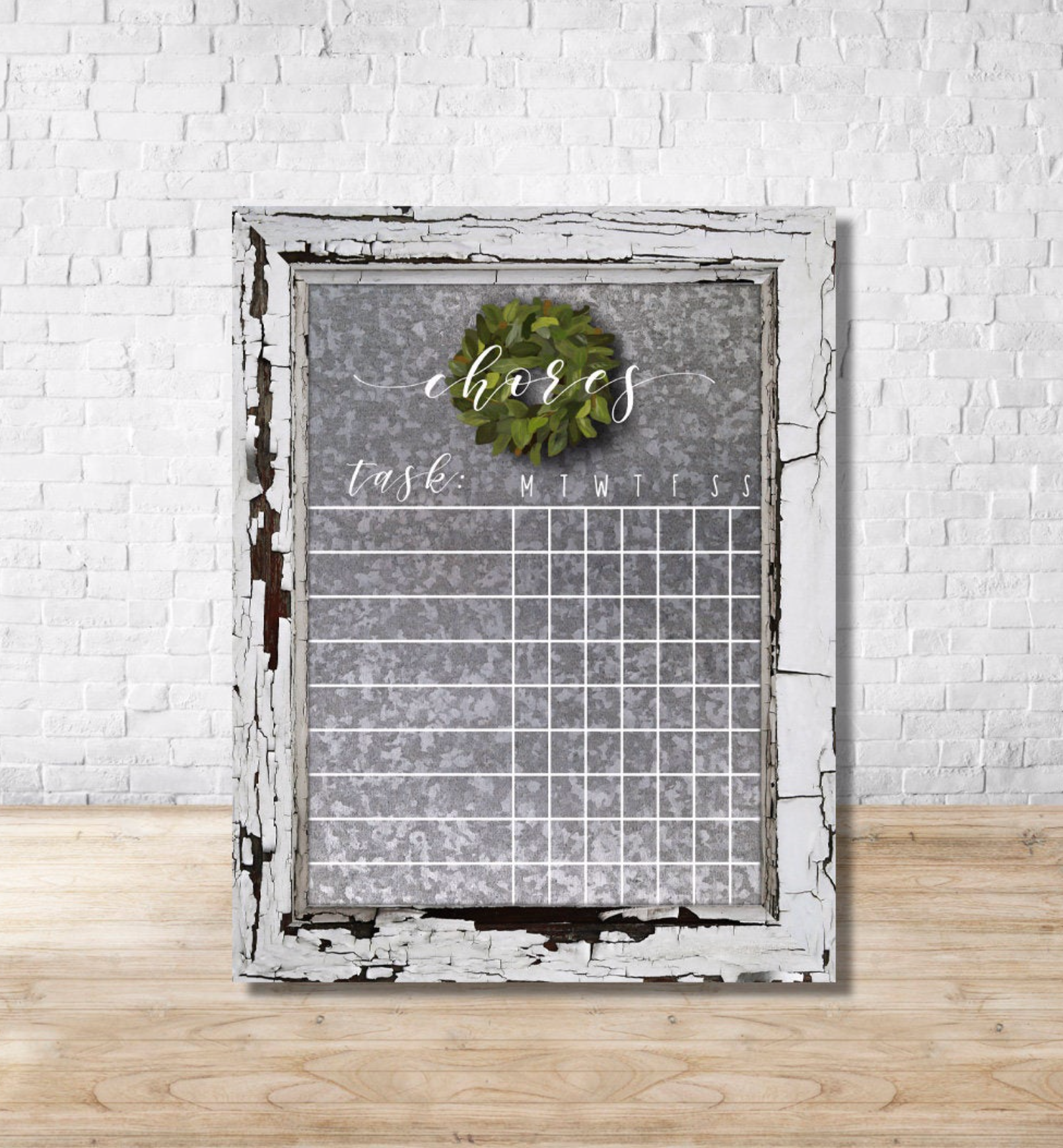 White Wooden Frame Corrugated Tin Farmhouse Magnolia Wreath Chore Chart Dry Erase Board